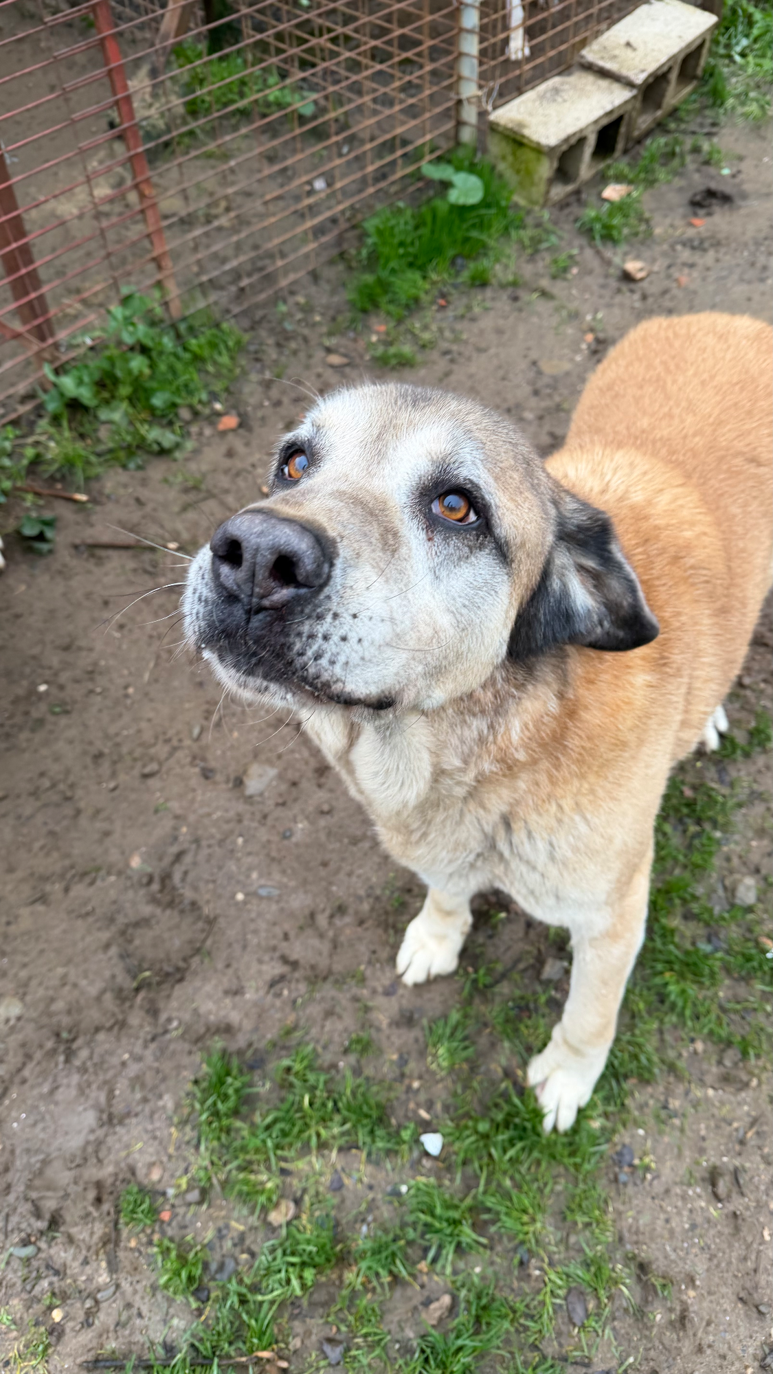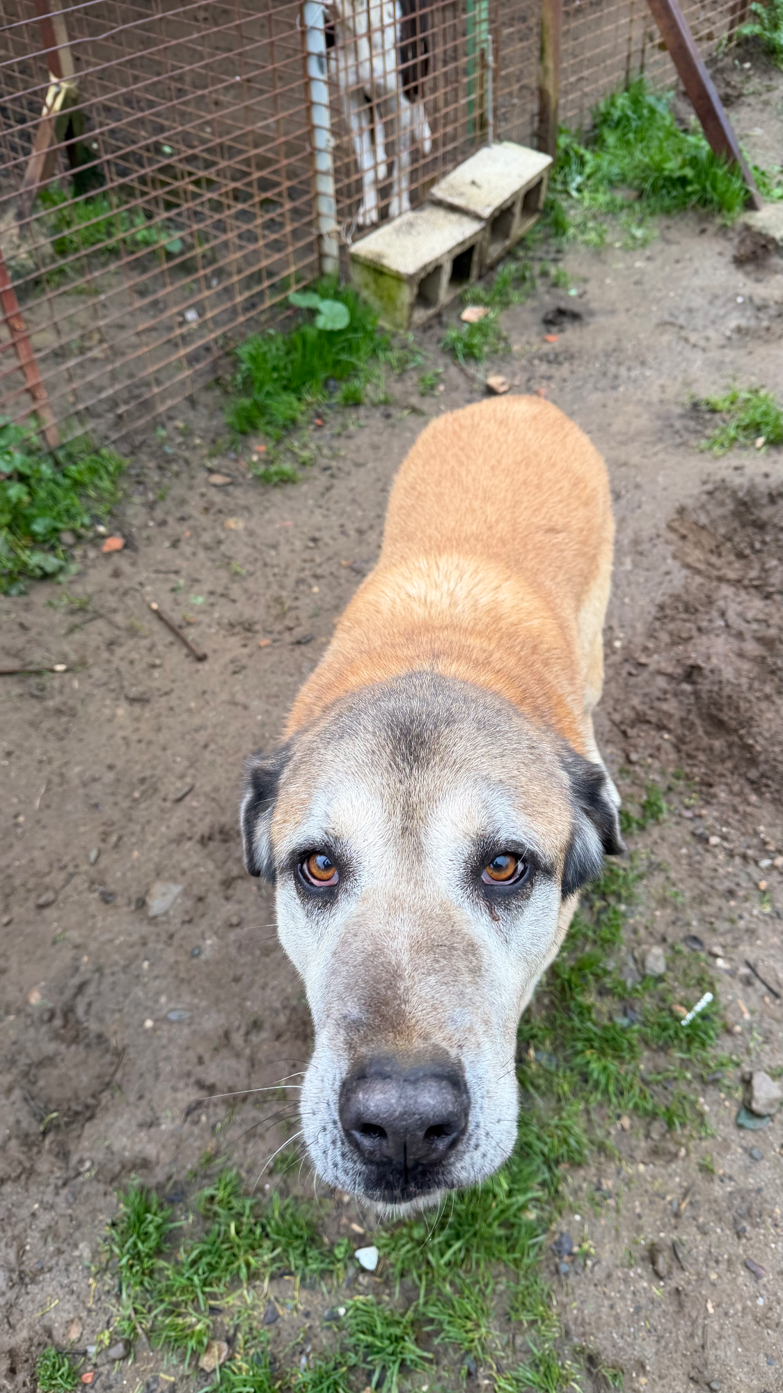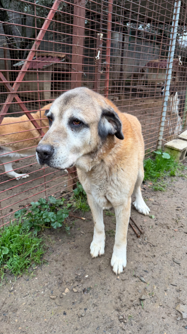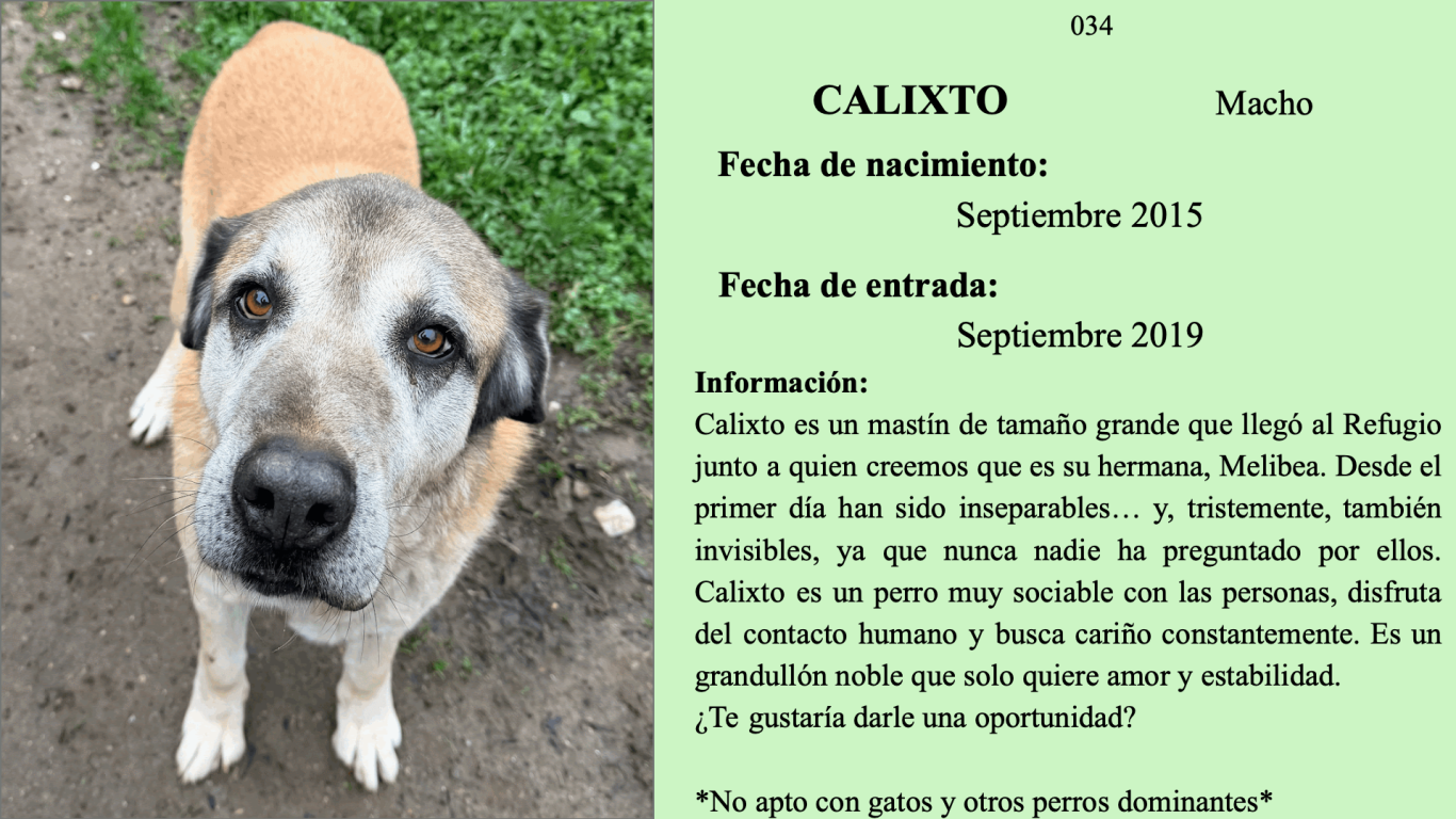 Calixto es un mastín de tamaño grande que llegó al Refugio junto a quien creemos que es su hermana, Melibea. Desde el primer día han sido inseparables… y, tristemente, también invisibles, ya que nunca nadie ha preguntado por ellos. Calixto es un perro muy sociable con las personas, disfruta del contacto humano y busca cariño constantemente. Es un grandullón noble que solo quiere amor y estabilidad.