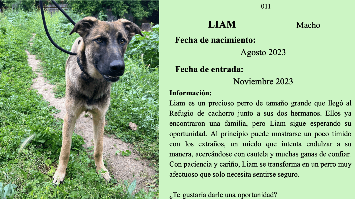 Liam es un precioso perro de tamaño grande que llegó al Refugio de cachorro junto a sus dos hermanos. Ellos ya encontraron una familia, pero Liam sigue esperando su oportunidad. Al principio puede mostrarse un poco tímido con los extraños, un miedo que intenta endulzar a su manera, acercándose con cautela y muchas ganas de confiar. Con paciencia y cariño, Liam se transforma en un perro muy afectuoso que solo necesita sentirse seguro.