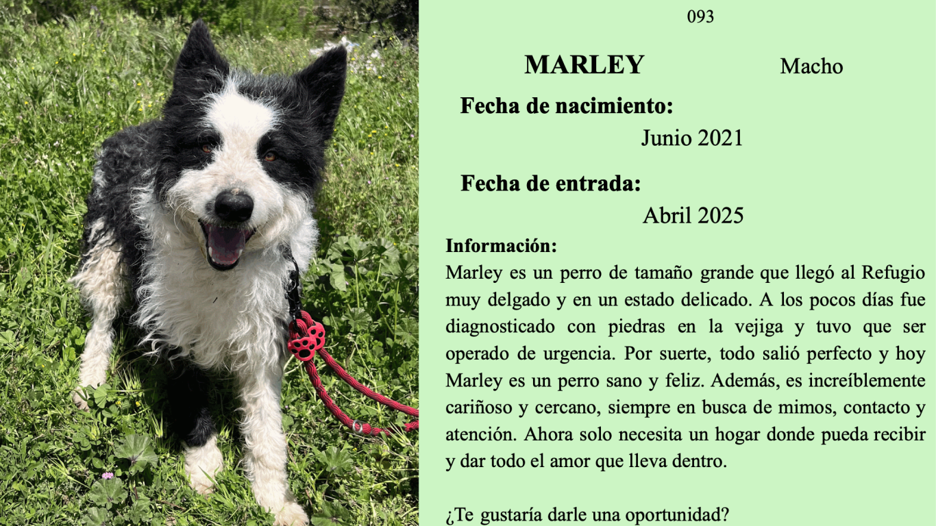 Marley es un perro de tamaño grande que llegó al Refugio muy delgado y en un estado delicado. A los pocos días fue diagnosticado con piedras en la vejiga y tuvo que ser operado de urgencia. Por suerte, todo salió perfecto y hoy Marley es un perro sano y feliz. Además, es increíblemente cariñoso y cercano, siempre en busca de mimos, contacto y atención. Ahora solo necesita un hogar donde pueda recibir y dar todo el amor que lleva dentro.