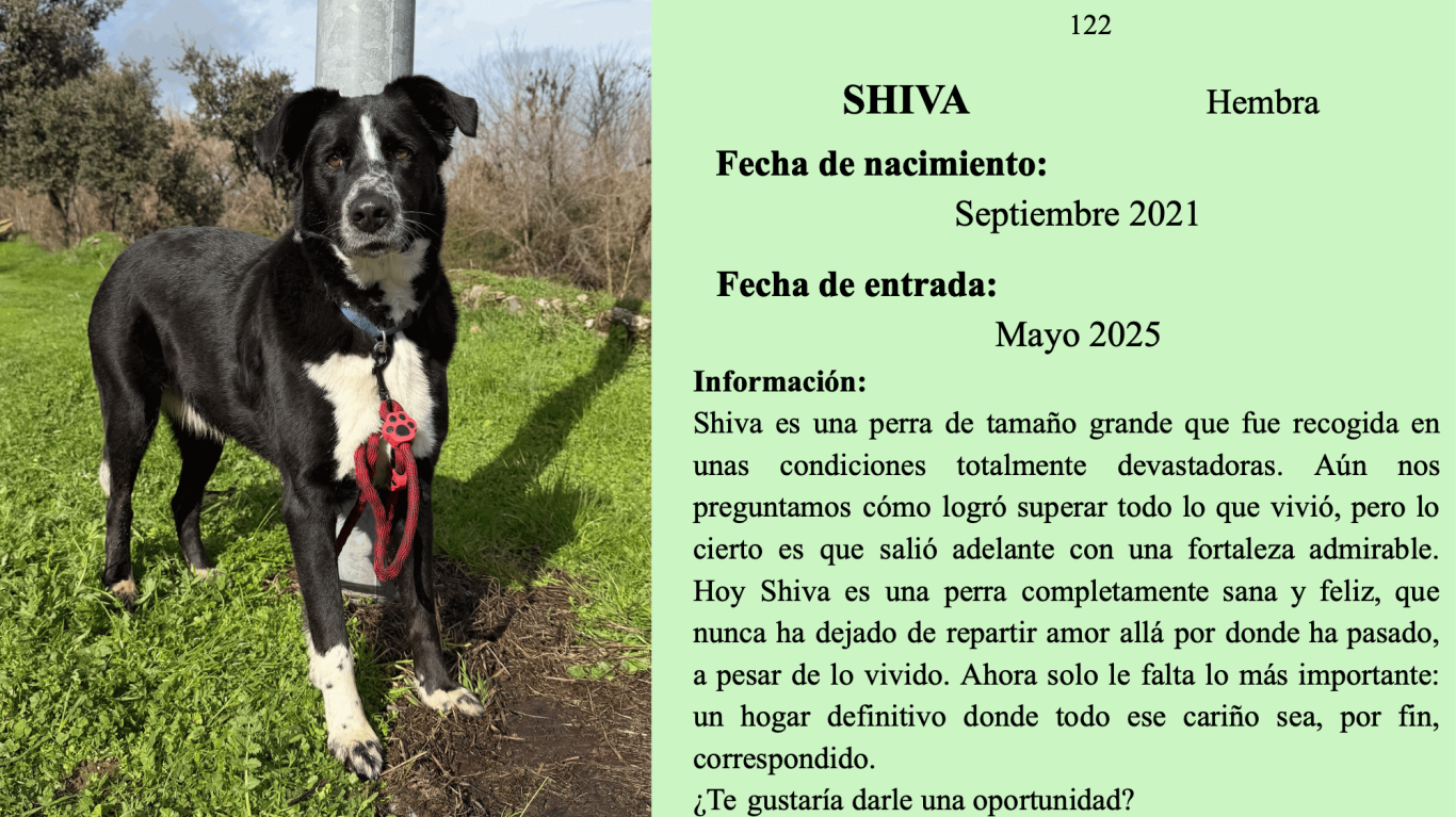 Shiva es una perra de tamaño grande que fue recogida en unas condiciones totalmente devastadoras. Aún nos preguntamos cómo logró superar todo lo que vivió, pero lo cierto es que salió adelante con una fortaleza admirable. Hoy Shiva es una perra completamente sana y feliz, que nunca ha dejado de repartir amor allá por donde ha pasado, a pesar de lo vivido. Ahora solo le falta lo más importante: un hogar definitivo donde todo ese cariño sea, por fin, correspondido.